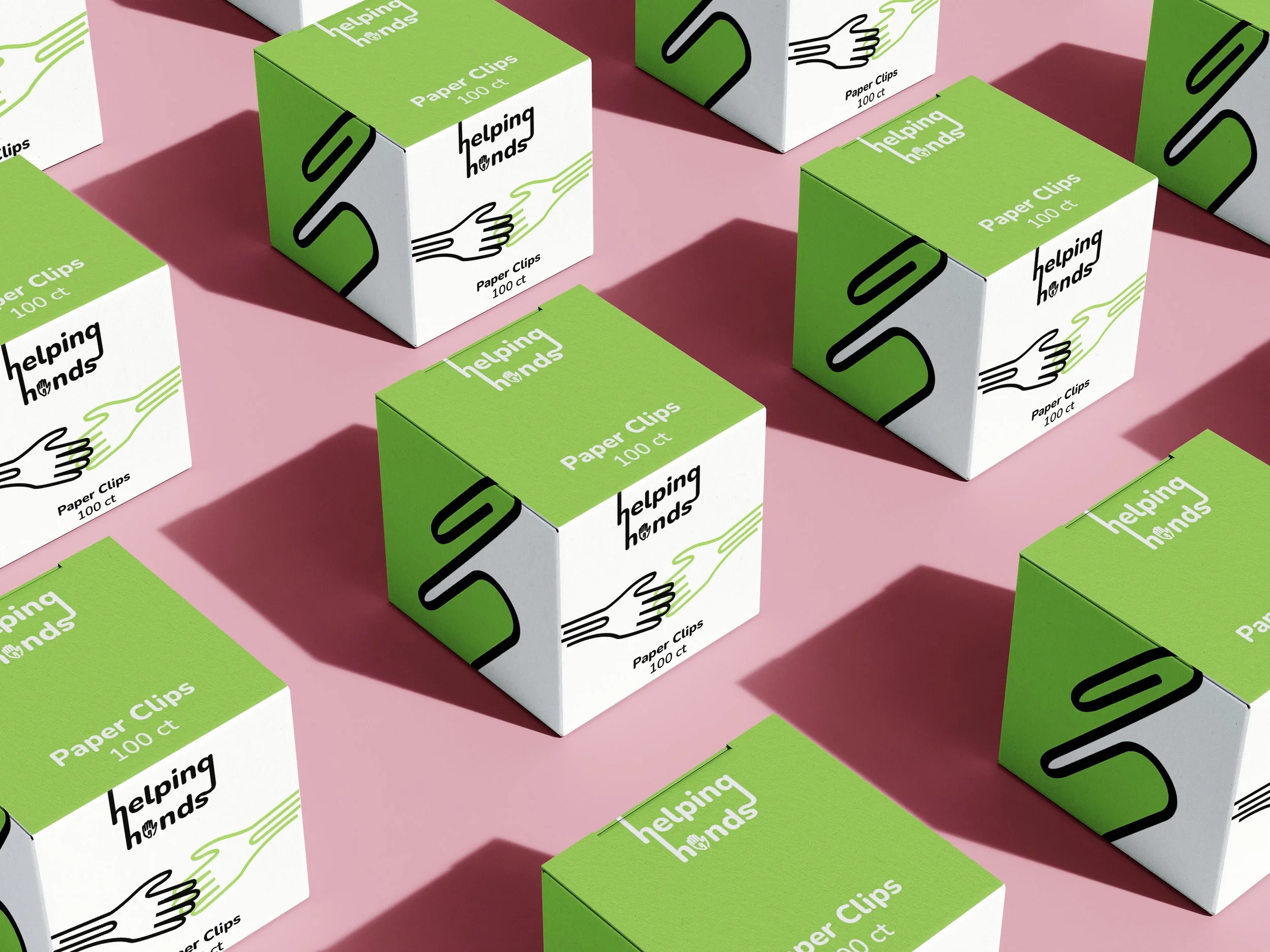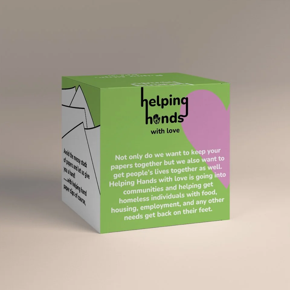 For this project I created a box packaging for a fake company I made up that makes office supplies. The logo was developed based on the hand-shaped paper clips inside the box and has an element of interconnectedness. The overall design for this box is minimal so it can be similar with its competitors but at the same time stands out with a more vibrant color and fun but subtle elements.